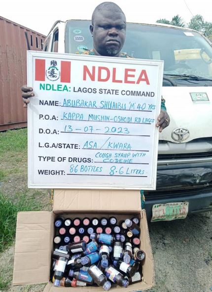 Babafemi stated that one Abubakar Shuaibu pictured above, was also arrested on Thursday 13th July at Cappa, Mushin/Oshodi road with 86 bottles of codeine-based cough syrup weighing 8.6 litres in his Toyota bus marked FFA 241YB, two other suspects: Razak Ogunbo and Adeola Idowu were nabbed Tuesday 11th July at Ikorodu with 51 litres of skuchies.